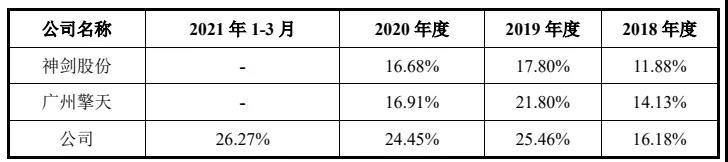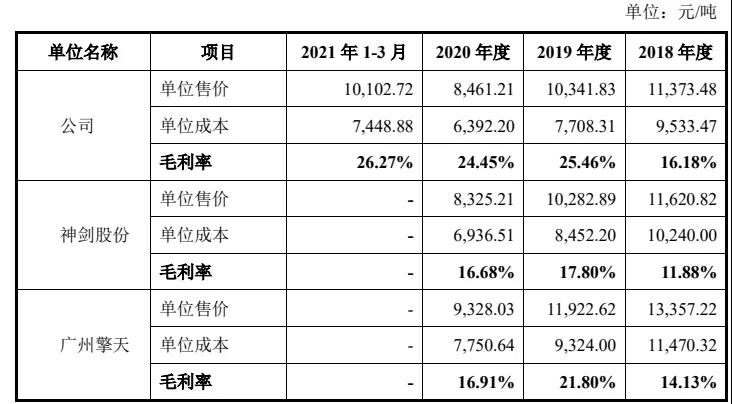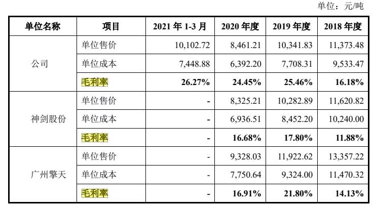 從光華科技的招股說明書來看,2018年光華科技的毛利率比神劍股份高4.3%,比擎天高2.05%;2019年毛利率比神劍股份高7.66%;比擎天高3.66%;2020年毛利率比神劍股份高7.77%;比擎天高7.54%。從這三組數據來看,光華科技與神劍股份、廣州擎天的毛利率在持續(xù)拉大,如此高的毛利率卻嚴重存疑。
