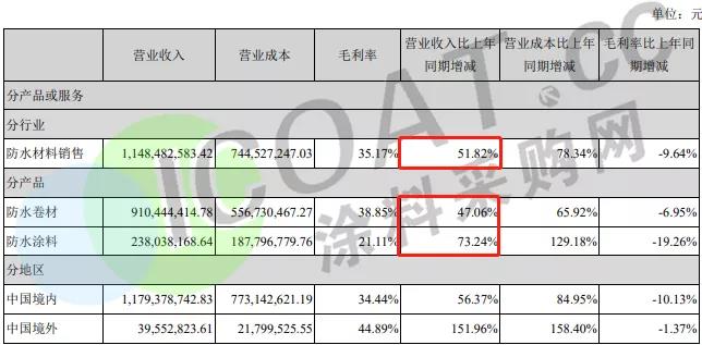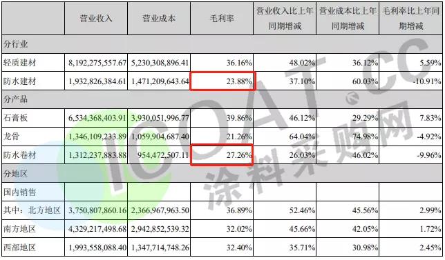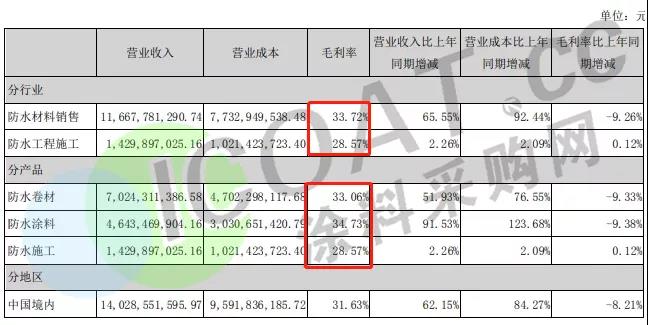 在毛利率方面,東方雨虹為31.61%。防水材料銷售行業毛利率為33.72%,防水工程施工行業毛利率為28.57%;防水卷材產品毛利率為33.06%,防水涂料產品毛利率為34.73%。