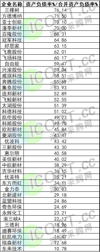 可以看出三棵樹(76.16%)、方德博納(71.50%)、亞士創能(70.10%)、潘季新材(70%)、百隆股份(68.31%)的資產負債率數值較高,其中三棵樹、方德博納、亞士創能的資產負債率超過了70%,飛鹿股份、科順股份、集泰股份則在適宜區域內。另外東方雨虹、金力泰等15家企業資產負債率低于40%,其中三德利、迪賽環保等五家企業資產負債率低于20%。
