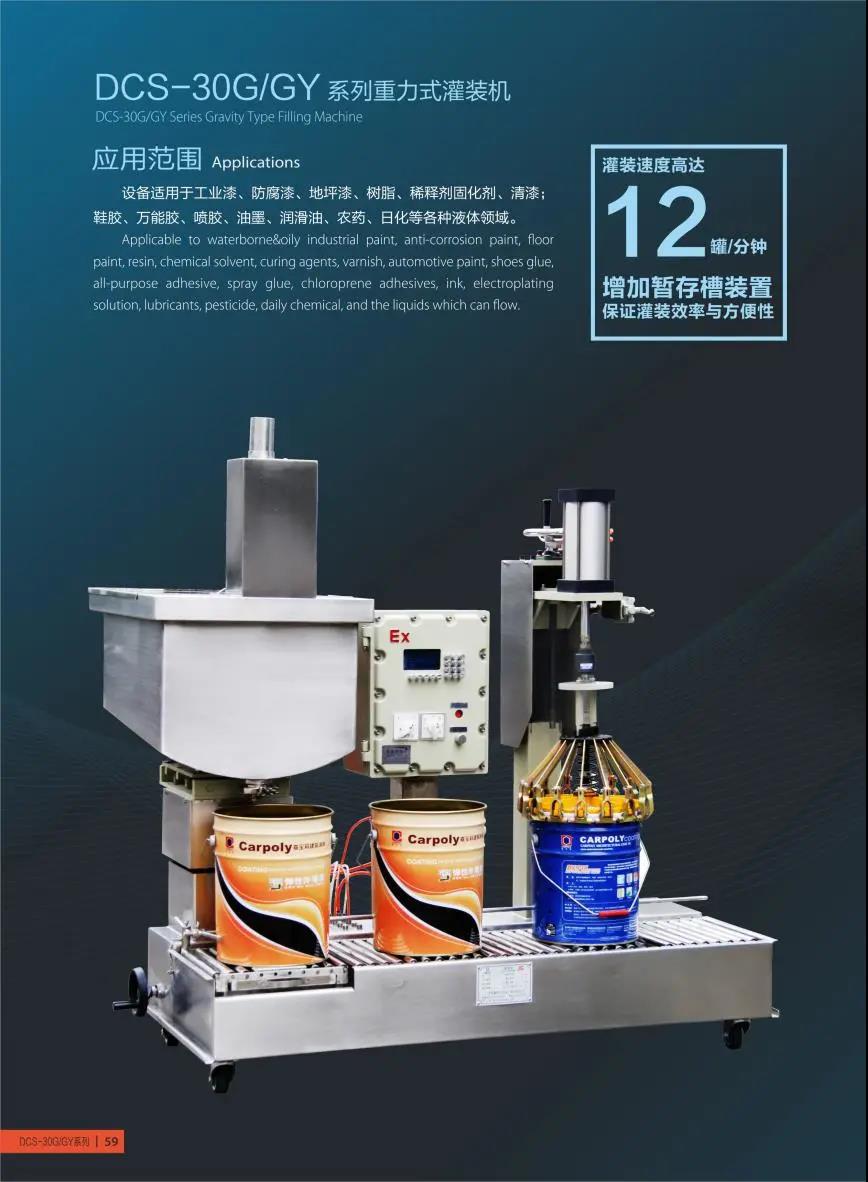 輝鑫機(jī)電明星產(chǎn)品DCS-30G/GY系列壓力式灌裝機(jī),灌裝速度高達(dá)12罐/分鐘,增加暫存槽裝置,保證灌裝效率與方便性。防爆灌裝機(jī)個性設(shè)計,一人操作,可隨操作工人習(xí)慣調(diào)整放桶位置都可灌裝,輥軸輸送;灌裝高度可調(diào),適合圓、方、扁及各種罐型及口徑液體灌裝,中轉(zhuǎn)槽恒壓易清洗,選擇式出料裝置,滿足客戶一機(jī)多用,多品種灌裝,靈活移動,二速灌裝“快&準(zhǔn)”,穩(wěn)定性好,減少損耗,可節(jié)省成本、減輕工人操作壓力等。