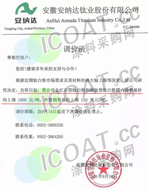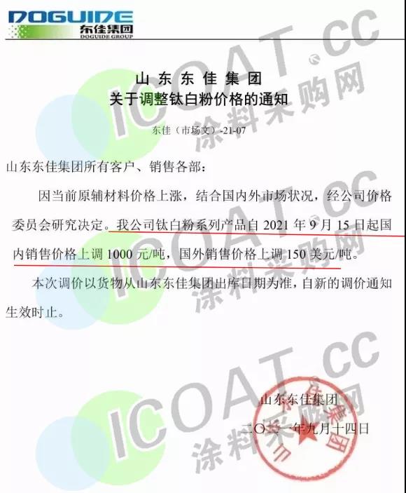 山東東佳:鈦白粉系列產品自2021年9月15日起國內銷售價格上調1000元/噸,國外銷售價格上調150美元/噸。