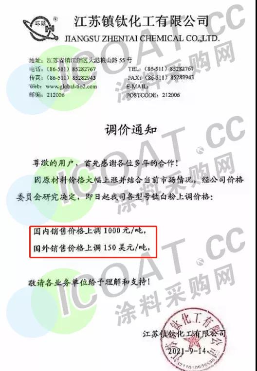 江蘇鎮鈦化工:即日起各型號鈦白粉上調價格:國內銷售價格上調1000元/噸,國外銷售價格上調150美元/噸。