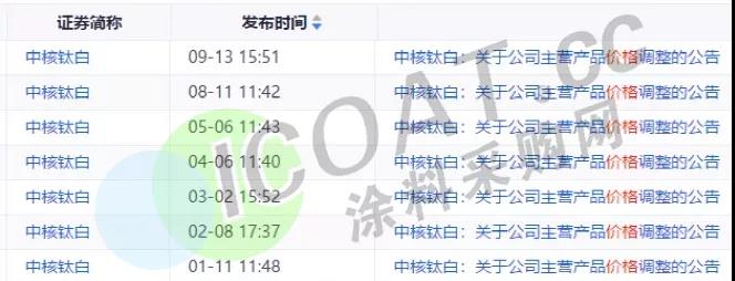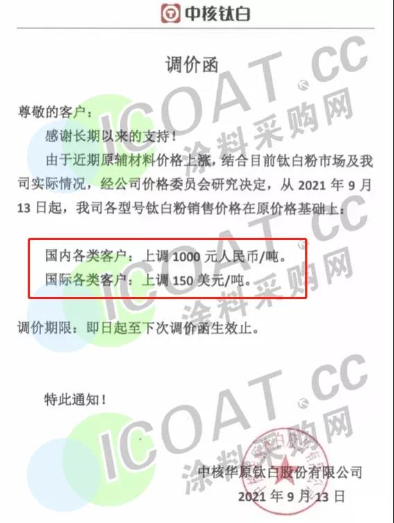 中核鈦白:9月13日起,各型號鈦白粉銷售價格在原價格基礎上:國內各類客戶上調1000元/噸,國際各類客戶上調150美元/噸。