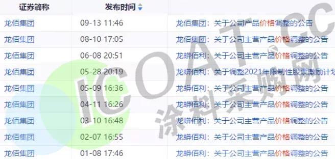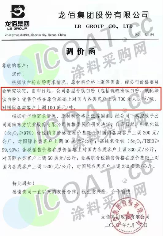 龍佰集團:自即日起,各型號鈦白粉(包括硫酸法鈦白粉、氯化法鈦白粉)銷售價格在原價基礎上對國內各類客戶上調700元/噸,對國際各類客戶上調100美元/噸。