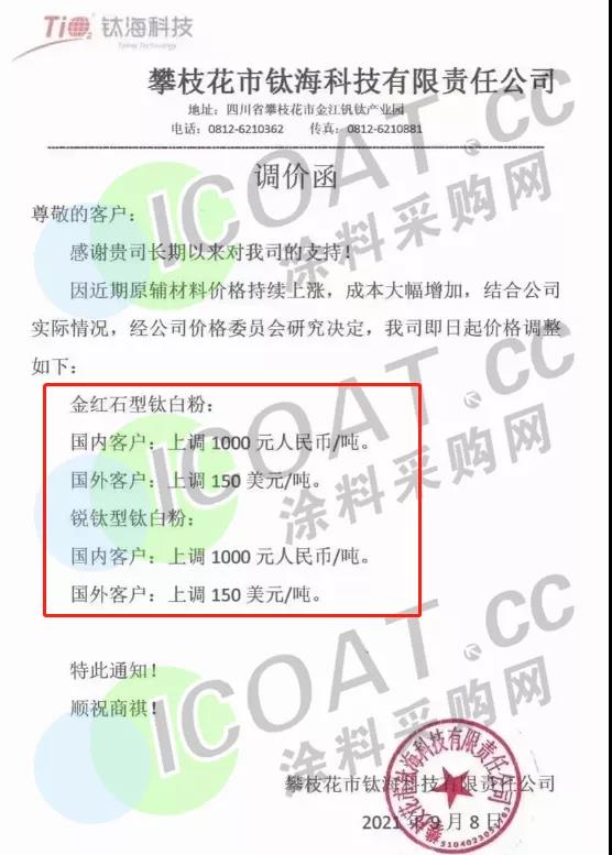 同日,江蘇鎮鈦化工、恒通鈦業、惠云鈦業等鈦白粉企業同步發函調漲。據涂料采購網了解,自9月以來,已有多家鈦白粉企業發函調漲,國內最高上漲1000元/噸,國際調漲最高150美元/噸,為鈦白粉行業的“金九銀十”拉開序幕。