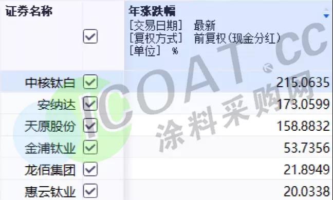 相關上市公司盈利豐厚,股價也表現強勁,中核鈦白今年股價漲幅達215%。