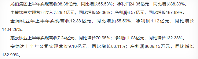 得益于主營產品價格超預期上漲,今年半年報各家鈦白粉企業業績均勢頭喜人。