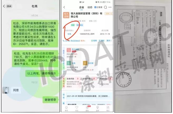 據恒大財富內部工作人員、恒大財富投資人李某透露:目前許家印妻子丁某、恒大財富董事長杜亮及其父親等一眾恒大高管,均已提前完成兌付。而在此前,網上曝出杜亮與杜亮父親杜永平,總計四筆合計1000多萬元的投資,已經全部提前兌付的交易憑證。杜亮承認自己已經提前兌付,原因是“家里有急事”,同時表示恒大集團一下子拿不出400億的現金來進行兌付所有的理財產品。