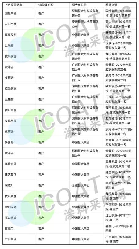 不難看出,這些客戶多半在家居、裝修、涂料、建材等行業,且都是本行業內的龍頭企業。在涂料行業來看,與恒大有業務關聯的企業也很多,且基本都是行業內的龍頭企業,比如凱倫股份、科順股份、東方雨虹、亞士漆、美涂士、三棵樹、立邦、巴德士、富思特、展辰新材、華潤漆等,根據恒大的財報,截至2020年末,中國恒大應付賬款及票據高達8291億,且恒大曾表示,一些與房地產開發相關的應付款項逾期未付,導致本集團部分項目停工,那么這近萬億的應付賬款和票據,涂料、原料供應商以及建筑商等其他環節的應付賬款并不是個小數目。
