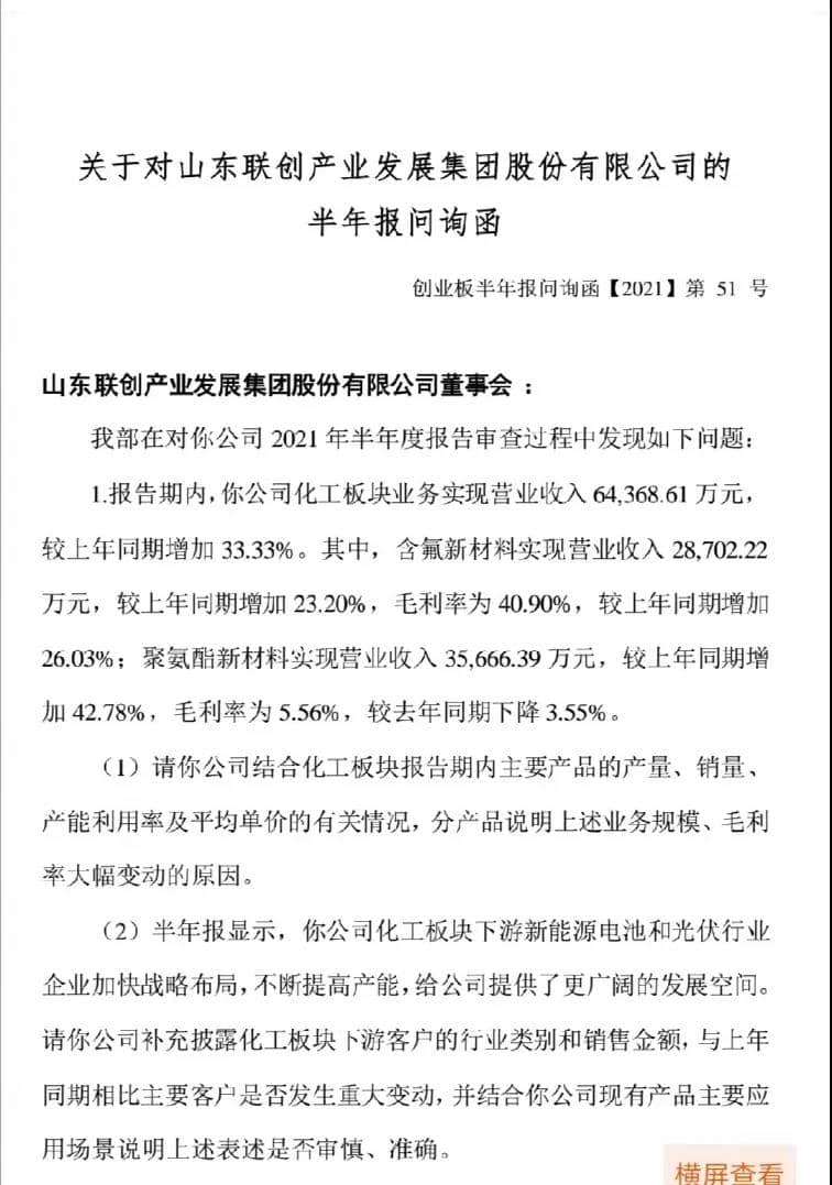 聯創股份在半年報中稱,“公司化工板塊下游新能源電池和光伏行業企業加快戰略布局,不斷提高產能,給公司提供了更廣闊的發展空間”。問詢函要求公司補充披露化工板塊下游客戶的行業類別和銷售金額,與上年同期相比主要客戶是否發生重大變動,并結合公司現有產品主要應用場景說明上述表述是否審慎、準確。