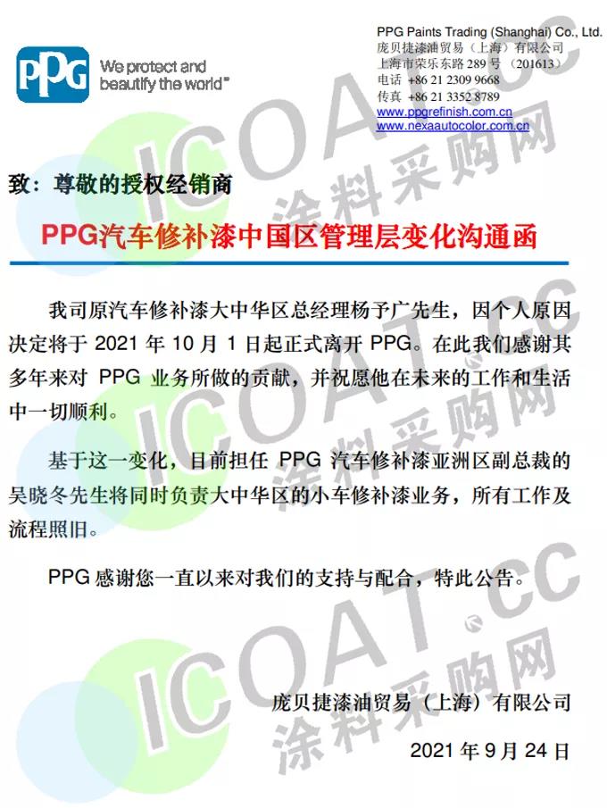 近日,龐貝捷漆油貿易(上海)有限公司發布《PPG汽車修補漆中國區管理層變化溝通函》稱,我司原汽車修補漆大中華區總經理楊予廣先生,因個人原因決定將于2021年10月1日起正式離開PPG。在此我們感謝其多年來對PPG業務所做的貢獻,并祝愿他在未來的工作和生活中一切順利。基于這一變化,目前擔任PPG汽車修補漆亞洲區副總裁的吳曉冬先生將同時負責大中華區的小車修補漆業務,所有工作及流程照舊。