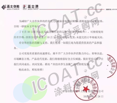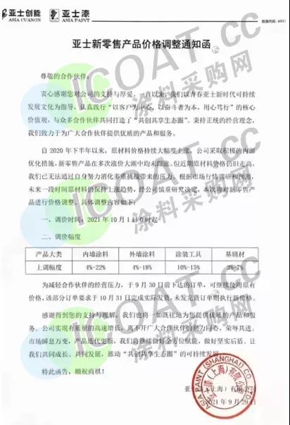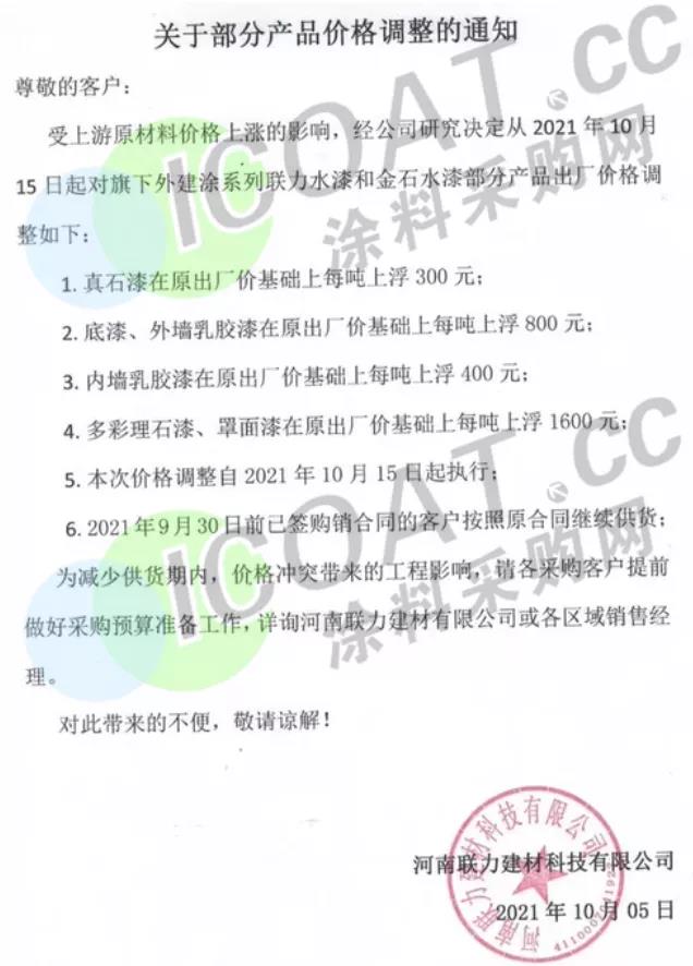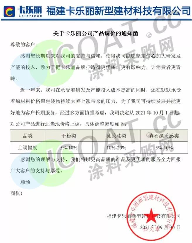2、底漆、面漆、真石漆、質感漆、罩面漆類產品全線上調15-20%以上。