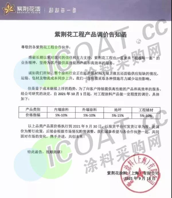 紫荊花涂料(上海)有限公司:自2021年10月1日起對工程涂料產品做一定程度的調價,其中: