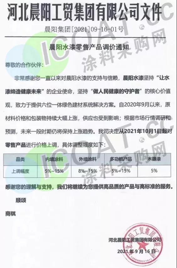 中華制漆(深圳)有限公司:10月18日起,低檔乳膠漆上調5%,中低檔及以上乳膠漆上調10%,其他水性漆(含輔料)上調5%,硝基漆、PU木器漆上調5%,FP工程漆產品上調10%。