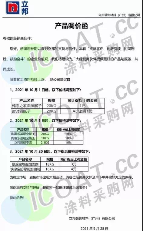 立邦裝飾材料(廣州)有限公司:10月1日起,產品價格進行調整:
