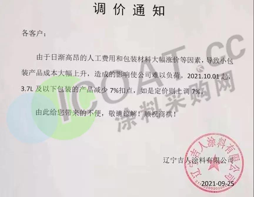 遼寧吉人涂料:10月1日起,3.7L及以下包裝的產品減少7%扣點,如是定價則上調7%。