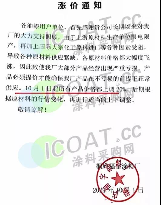 桐廬福宇涂料廠:10月1日起所有產品價格上調20%。