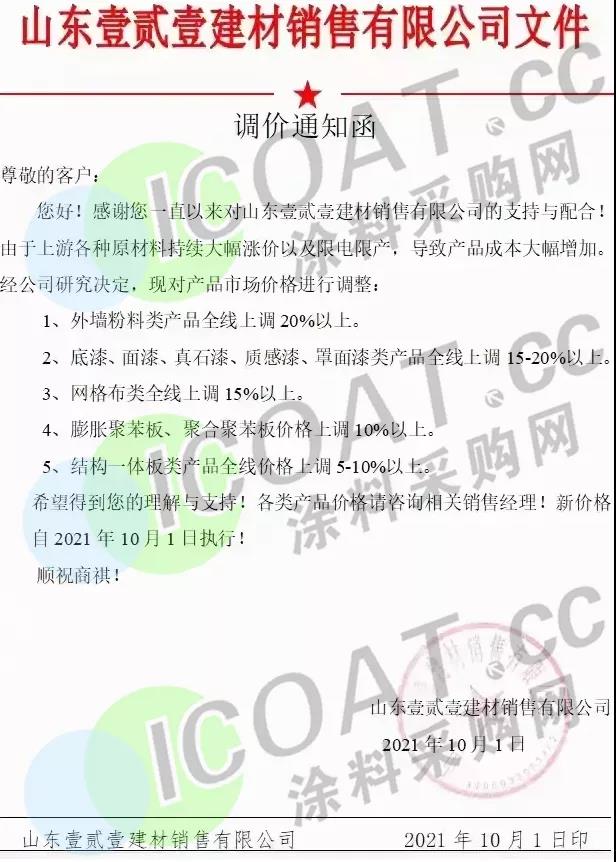 山東壹貳壹建材:經研究決定,10月1日起,對產品市場價格進行調整: