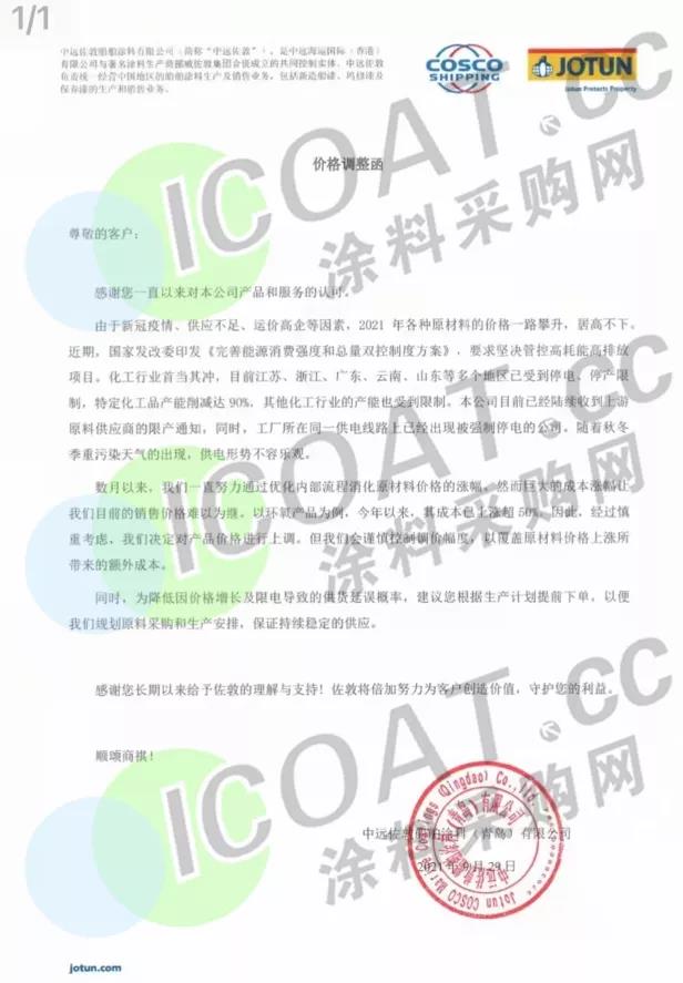 中遠佐敦船舶涂料(青島)有限公司:2021年各種原材料的價格一路攀升,居高不下。企業目前已經陸續收到上游原料供應商的限產通知,同時,工廠所在同一供電線路上已經出現被強制停電的公司。今年以來,其成本已上漲超50%。因此,經過慎重考慮,決定對產品價格進行上調。