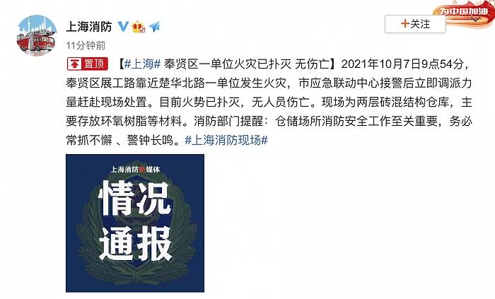 近日,上海市消防救援總隊官方微博通報:2021年10月7日9點54分,奉賢區展工路靠近楚華北路一單位發生火災,市應急聯動中心接警后立即調派力量趕赴現場處置。