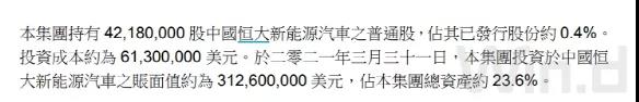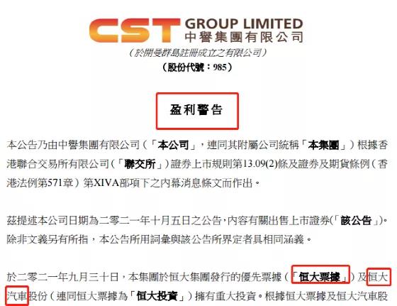 根據中譽集團公告,截至2021年9月30日,其在恒大集團優先票據及恒大汽車股票上擁有重大投資。以恒大票據及恒大汽車股票截至9月30日的收市價估算,其預期截至2021年9月30日的六個月中期業績將錄得重大虧損,其中來自恒大優先票據和恒大汽車股票的未變現虧損分別約1.35億美元及約2.96億美元。