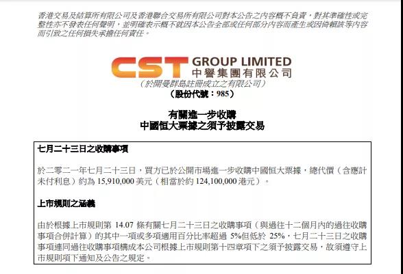 2021年7月19日,廣發銀行提出凍結恒大資金的消息傳出之后,恒大債券暴跌。當晚,中譽集團突發公告稱,其通過證券經紀商于公開市場收購總額為1100萬美元2024年到期的10.5%中國恒大優先票據。7月23日,中譽集團再發公告稱,“公司的間接全資附屬公司立天科技有限公司已于公開市場進一步收購中國恒大票據”,總代價(含應計未付利息)約為1591萬美元(相當于約1.241億港元)。