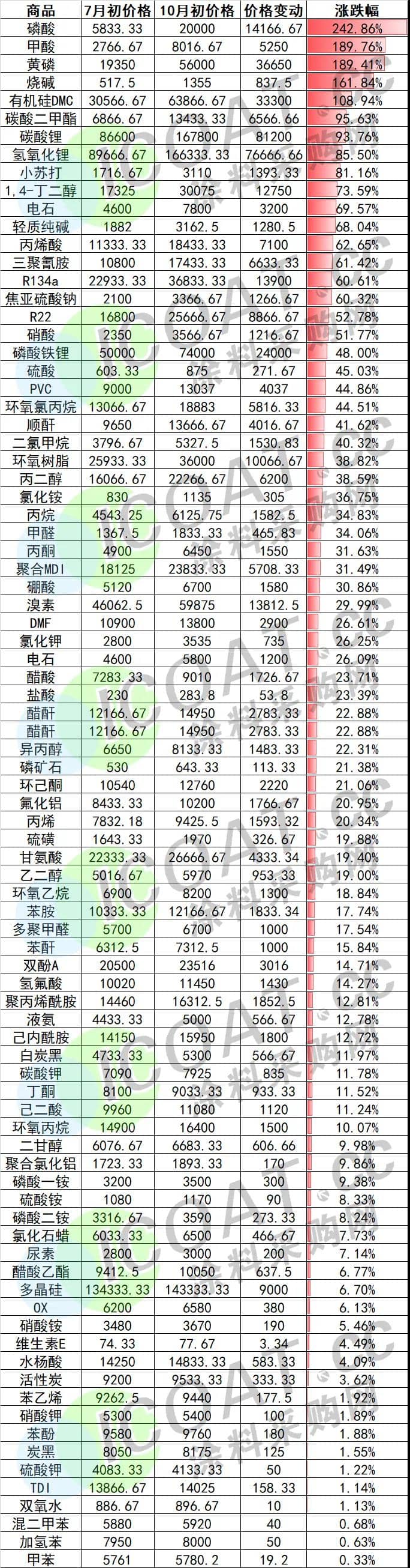 此外,不少原材料在近期噸價上漲超千元,甚至高達萬元,漲幅近200%:
