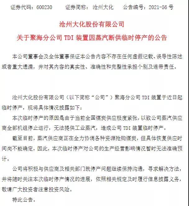 近日,滄州大化(或稱“公司”)公告,公司聚海分公司TDI裝置近日起臨時停產,原因是由于當前全國煤炭供應極度緊張,以致公司蒸汽供應商全部機組停止運行,無法提供工業蒸汽,造成公司TDI裝置臨時停產。截至目前,蒸汽供應商正在全力協調各種資源搶購煤炭,但具體恢復供應時間尚不能確定。