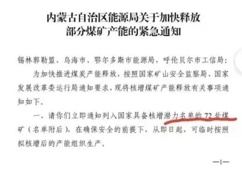 然而,一份“內蒙古自治區能源局關于加快釋放部分煤礦產能的緊急通知”在網絡流傳。文件要求錫林郭勒盟、烏海市、鄂爾多斯市能源局、呼倫貝爾市工信局立即通知列入國家具備核增潛力名單的72處煤礦,在確保安全的前提下,從10月7日起,可臨時按照擬核增后的產能組織生產。