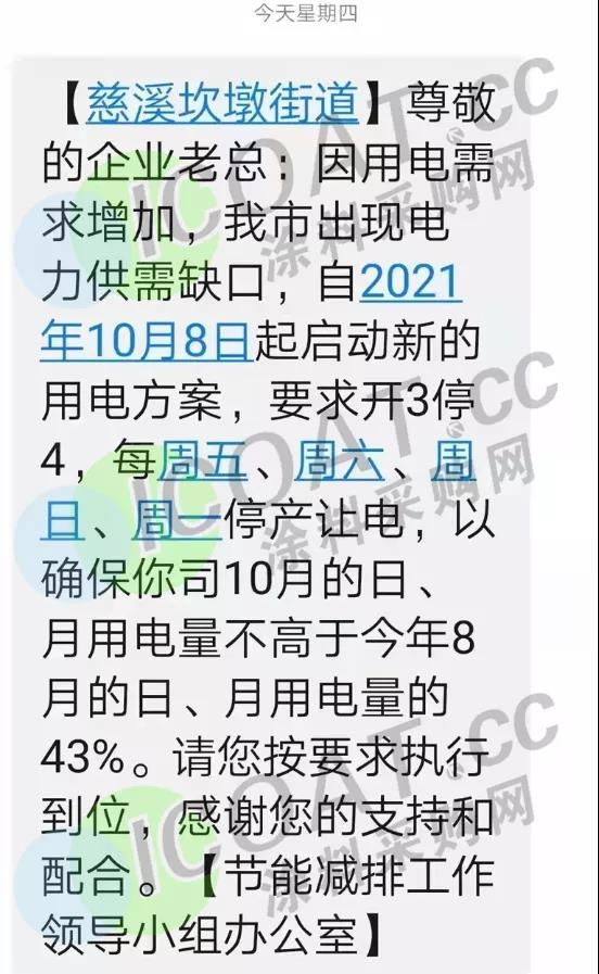 假期結束后,福建廈門、山東諸城、浙江慈溪、江蘇等多地企業接到通知,新一輪“有序用電”正式開啟,“開四停三”、“開三限三”等方案陸續出爐,并規定將持續在線監測企業用電情況,對未按規定停產限電的,將采取強制停電措施,并按有關政策規定予以追責。