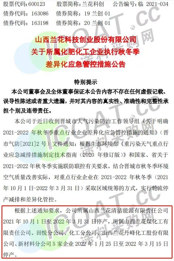 蘭花科創隨即宣布,企業所屬山西蘭花清潔能源有限責任公司2021年10月1日至2022年3月31日停產,所屬山西蘭花煤化工有限責任公司、田悅分公司、化工分公司、山西蘭花丹峰化工股份有限公司、新材料分公司5家企業2022年1月25日至2022年3月15日停產。