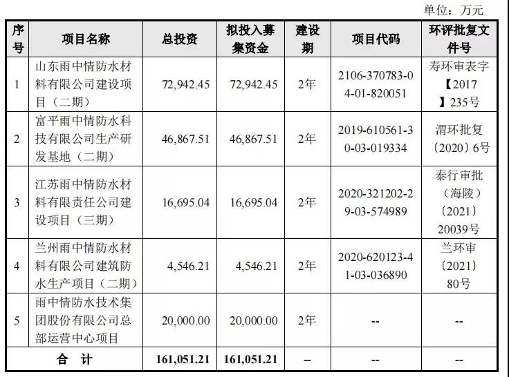 招股書顯示,雨中情集團擬發行不超過5305萬股,發行后總股本不超過21220萬股。公司擬募集資金16.105億元用于山東雨中情防水材料有限公司建設項目(二期)、富平雨中情防水科技有限公司生產研發基地(二期)、江蘇雨中情防水材料有限責任公司建設項目(三期)、蘭州雨中情防水材料有限公司建筑防水生產項目(二期)、雨中情防水技術集團股份有限公司總部運營中心項目。