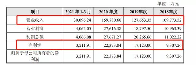 財務數據上,據招股書,于2018年-2021年1-3月(下稱:報告期),雨中情實現營收10.98億元、12.77億元、15.98億元、3.01億元,同期凈利潤分別為9,307.26萬元、1.71億元、2.24億元、3,211.91萬元。