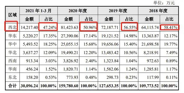 據招股書顯示,銷售區域上,雨中情起步于西北地區。整個西北地區的營業收入占比最高,分別為 58.41%、56.55%、50.96%和 47.24%。雨中情方面稱,2018 年-2020 年,隨著公司“立足西北、面向全國”發展戰略的實施,尤其是先后在江蘇泰州、山東壽光投資布局生產基地,公司在華東、華北等區域的銷售額及銷售占比逐年增長,西北地區銷售收入在保持穩步增長的基礎上,占比則有所下降。