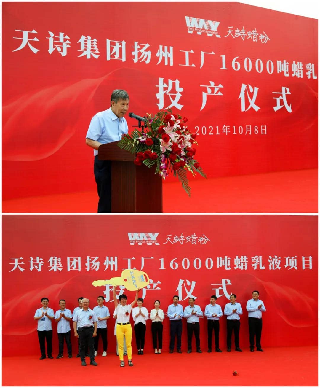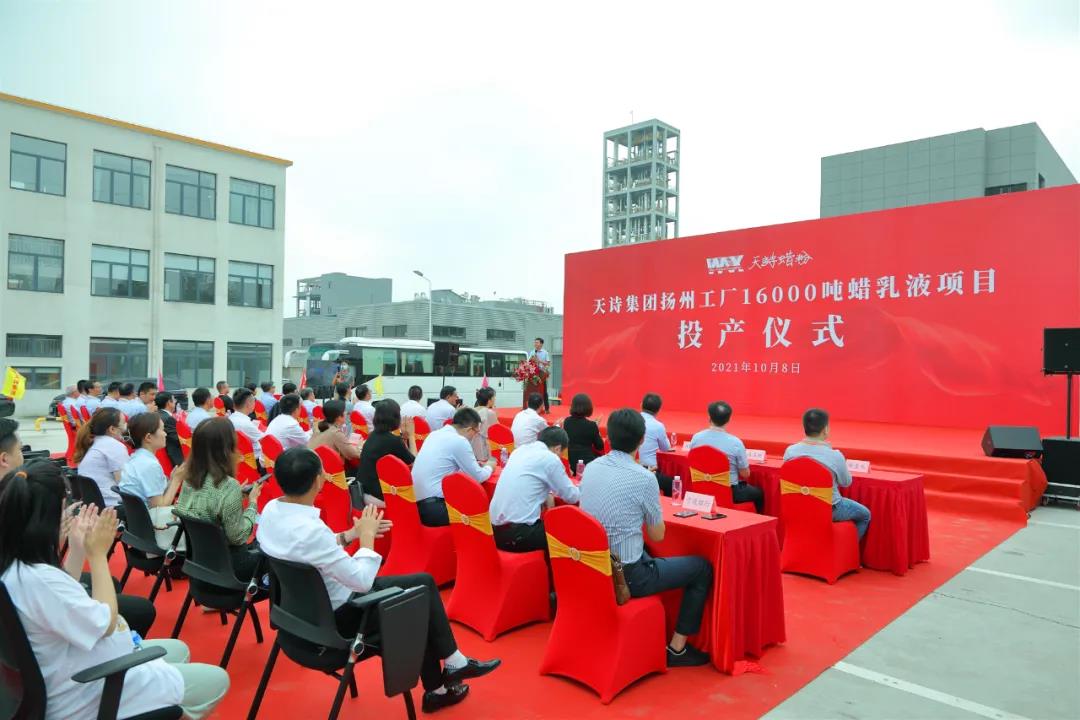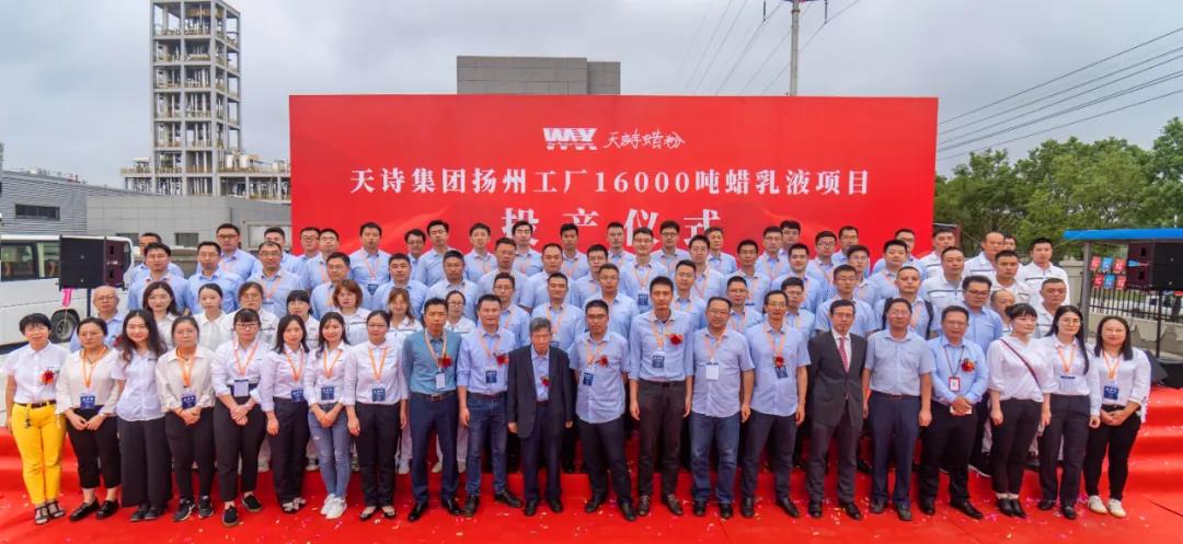 近日,中國知名蠟助劑生產商——天詩集團16000噸蠟乳液項目投產儀式在揚州天詩工廠舉行。儀征市領導、揚州化工園區和管理辦領導,天詩集團創始人于天詩,天詩集團總裁于海闊,揚州天詩總經理阮世澤,集團全體領導班子成員出席了投產儀式。該項目標志著揚州天詩成為國內最大的聚乙烯蠟精制/氧化/乳化全產業鏈覆蓋一體化工廠。