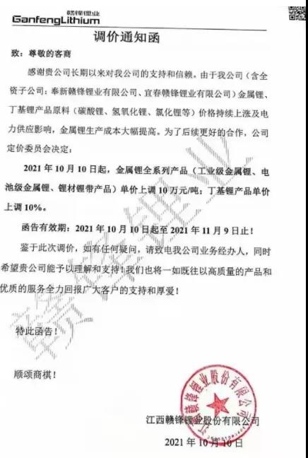 贛鋒鋰業(yè)表示,調(diào)價原因系原料價格持續(xù)上漲及電力供應(yīng)影響,金屬鋰生產(chǎn)成本大幅提高所致。