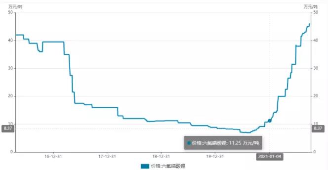 六氟磷酸鋰的價格從年初的11.25萬元/噸漲至當前的46萬元/噸,年上漲幅度超3倍。據(jù)高工鋰電估計,2021年全球六氟磷酸鋰將出現(xiàn)供需缺口,供給量和需求量預計分別為5.9萬噸和6.35萬噸。由于擴產(chǎn)周期較長,行業(yè)新增供給需要1.5-2年,釋放時間較長,預計六氟磷酸鋰的價格到明年一季度還將維持高位,供需關(guān)系依然偏緊。
