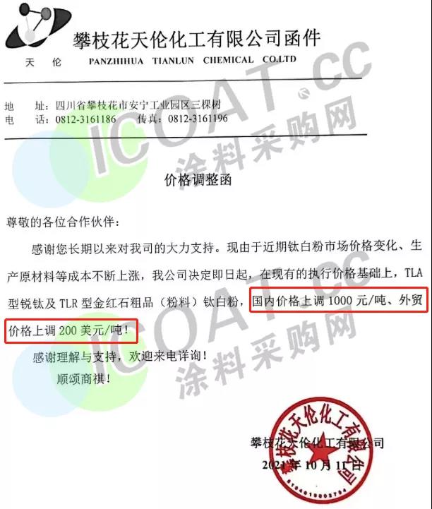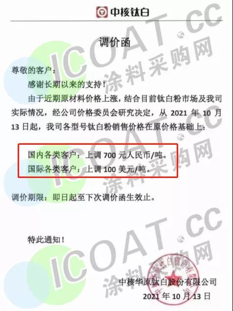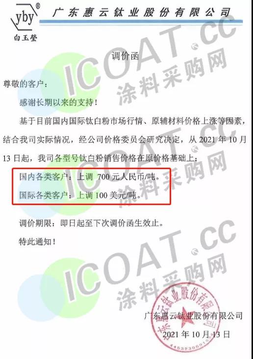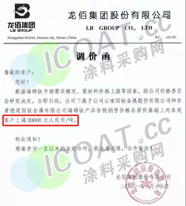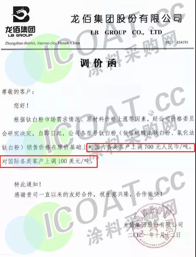 龍佰集團:自12日起,各型號鈦白粉(包括硫酸法鈦白粉、氯化法鈦白粉)銷售價格在原價基礎上對國內各類客戶上調700元/噸,對國際各類客戶上調100美元/噸。