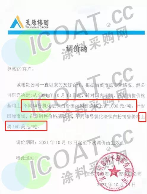 天原集團:10月13日起,不同牌號氯化法鈦白粉國內售價上調1000元/噸,國際市場上調150美元/噸。