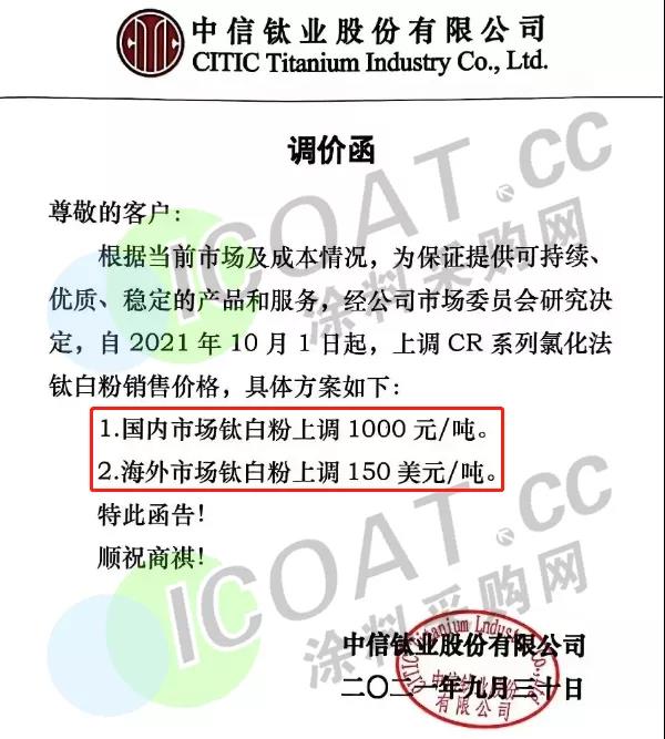 中信鈦業:10月1日起,上調CR系列氯化法鈦白粉銷售價格,具體方案如下:國內市場鈦白粉上調1000元/噸,海外市場鈦白粉上調150美元/噸。