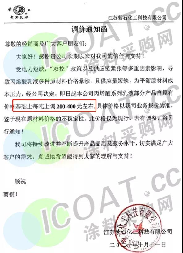 江蘇紫石乳液:11日起,丙烯酸系列乳液部分產品自原有價格基礎上每噸上漲200-400元/噸。