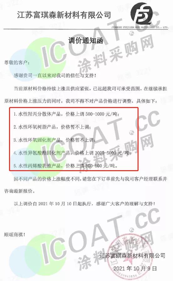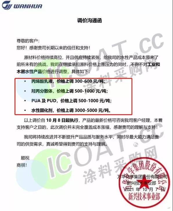 水性異氰酸酯固化劑產品,價格上調3000-5000元/噸;水性丙烯酸乳液產品,價格上調500-800元/噸。