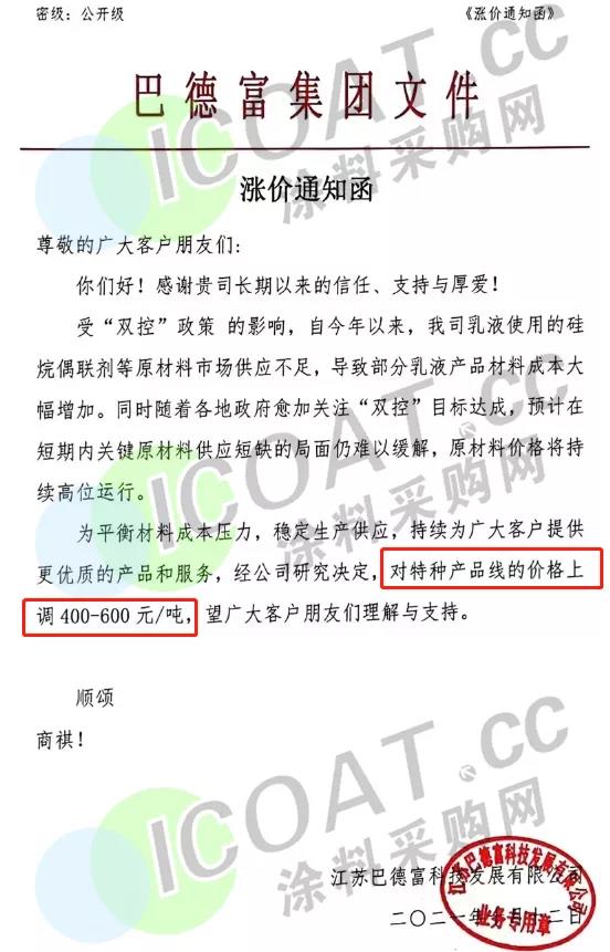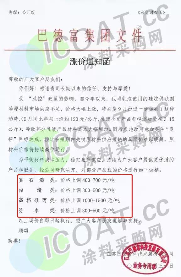 巴德富:真石漆類上漲400-700元/噸,內墻類上漲300-500元/噸,高檔硅丙類上漲1000-1500元/噸,防水類上漲300-500元/噸。對特種產品線的價格上調400-600元/噸。