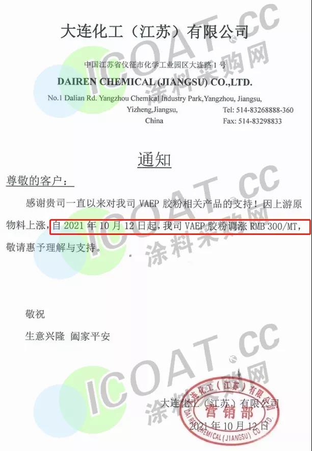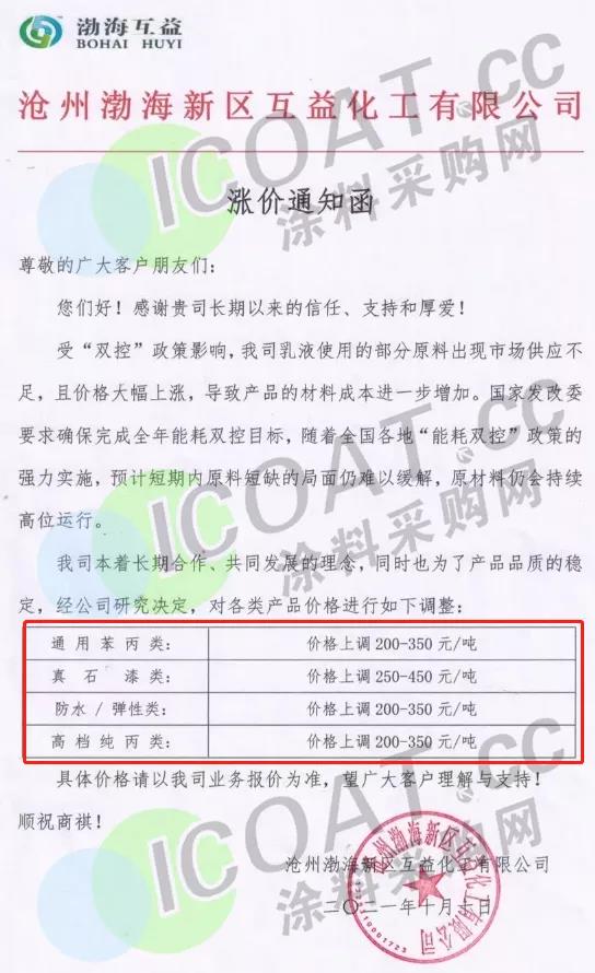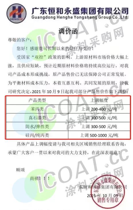 恒和永盛:10月9日起,苯丙類上調200-400元/噸,真石漆類上調300-500元/噸,防水/彈性類上調300-500元/噸。硅丙/純丙類上調500-1000元/噸。