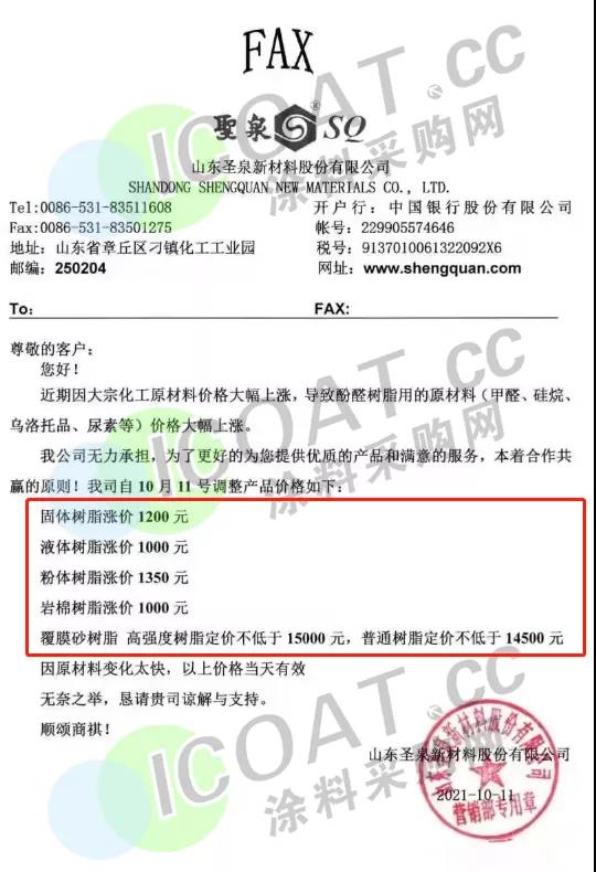 山東圣泉新材料:固體樹脂漲價1200元,液體樹脂漲價1000元,粉體樹脂漲價1350元,巖棉樹脂漲價1000元,覆膜砂樹脂、高強度樹脂定價不低于15000元,普通樹脂定價不低于14500元。