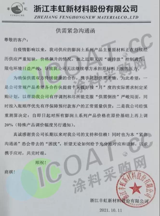 浙江豐虹新材料:11日起,所有膨潤土系列產品價格在原價基礎上再上調20%。