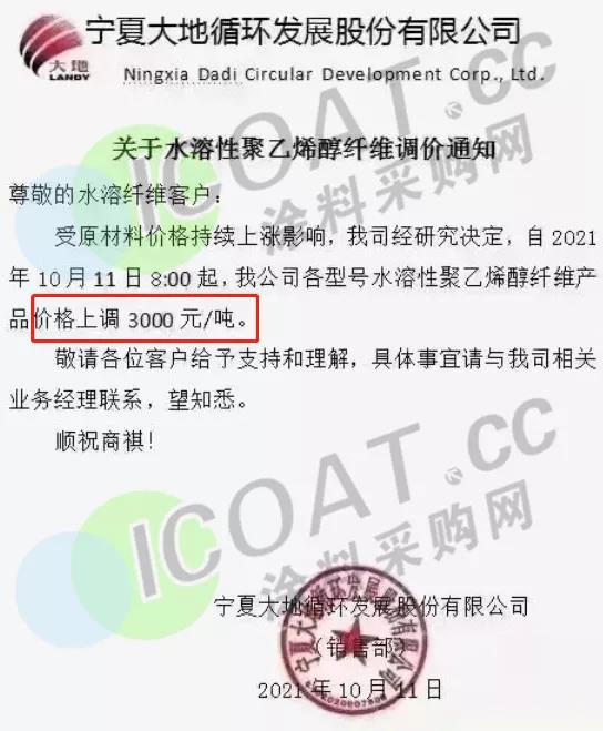 寧夏大地循環:11日8:00起,各型號水溶性聚乙烯醇纖維產品價格上調3000元/噸。