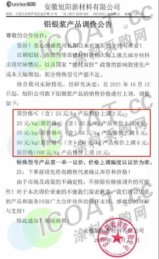 安徽旭陽新材料:10月12日起,旗下鋁銀漿產品的銷售價格進行上調,調整如下: