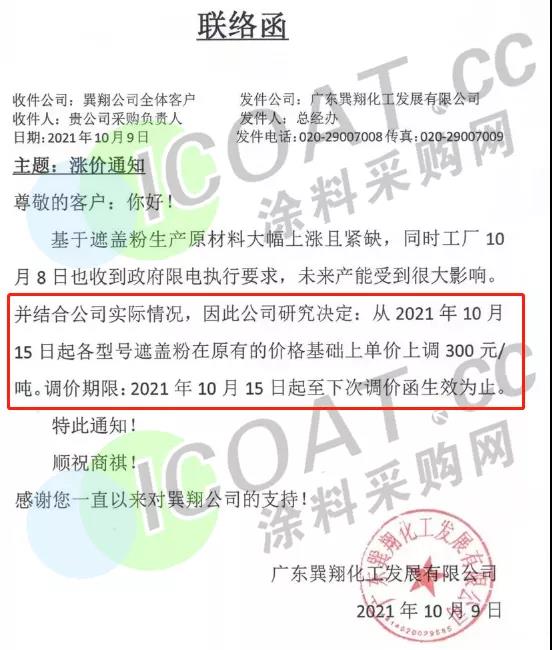 廣東巽翔化工:10月15日起,各型號遮蓋粉在原有的價格基礎上單價上調300元/噸。