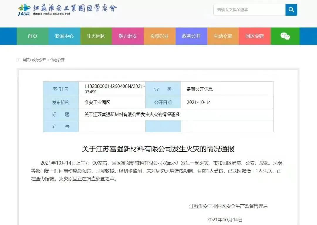 近日,淮安工業(yè)園區(qū)安全生產(chǎn)監(jiān)督管理局通過淮安工業(yè)園區(qū)管委會官網(wǎng)公布了《關(guān)于江蘇富強新材料有限公司發(fā)生火災(zāi)的情況通報》,通報稱:10月14日上午7:00左右,園區(qū)富強新材料有限公司雙氧水廠發(fā)生一起火災(zāi)?;窗彩泻蛨@區(qū)消防、公安、應(yīng)急、環(huán)保等部門第一時間啟動應(yīng)急預(yù)案,開展救援。經(jīng)初步監(jiān)測,未對周邊環(huán)境造成影響。目前1人受傷,已送醫(yī)救治;1人失聯(lián),正在全力搜救。火災(zāi)原因正在調(diào)查處置之中。